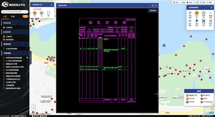 平臺基于標準化的工作流程,采用多重校審及分級管控的手段,通過配置,完成了從數據歸檔入庫到在線借閱的全過程服務與管理,滿足生產效率的同時保證了數據的準確性及安全性。平臺支持鉆孔地層的標準化,完成了歷史存量數據的坐標轉換,解決了因地層代號和坐標系不統一而無法共享的問題。平臺實現了在網頁端基于CAD繪制勘察圖件的功能,支持柱狀圖、剖面圖、等值線圖的自動生成。可有針對性的對研究區域鉆孔篩選過濾,使統計分析結果可靠度更高。平臺具有較完善的數據接口,實現了與公司自主研發的勘察資料處理軟件的無縫對接,兼容各種地質專題GIS數據。不僅可直接入庫勘察軟件數據,還能以項目和鉆孔的維度輸出涵蓋地層及試驗信息的可在勘察軟件中直接利用的文件。
